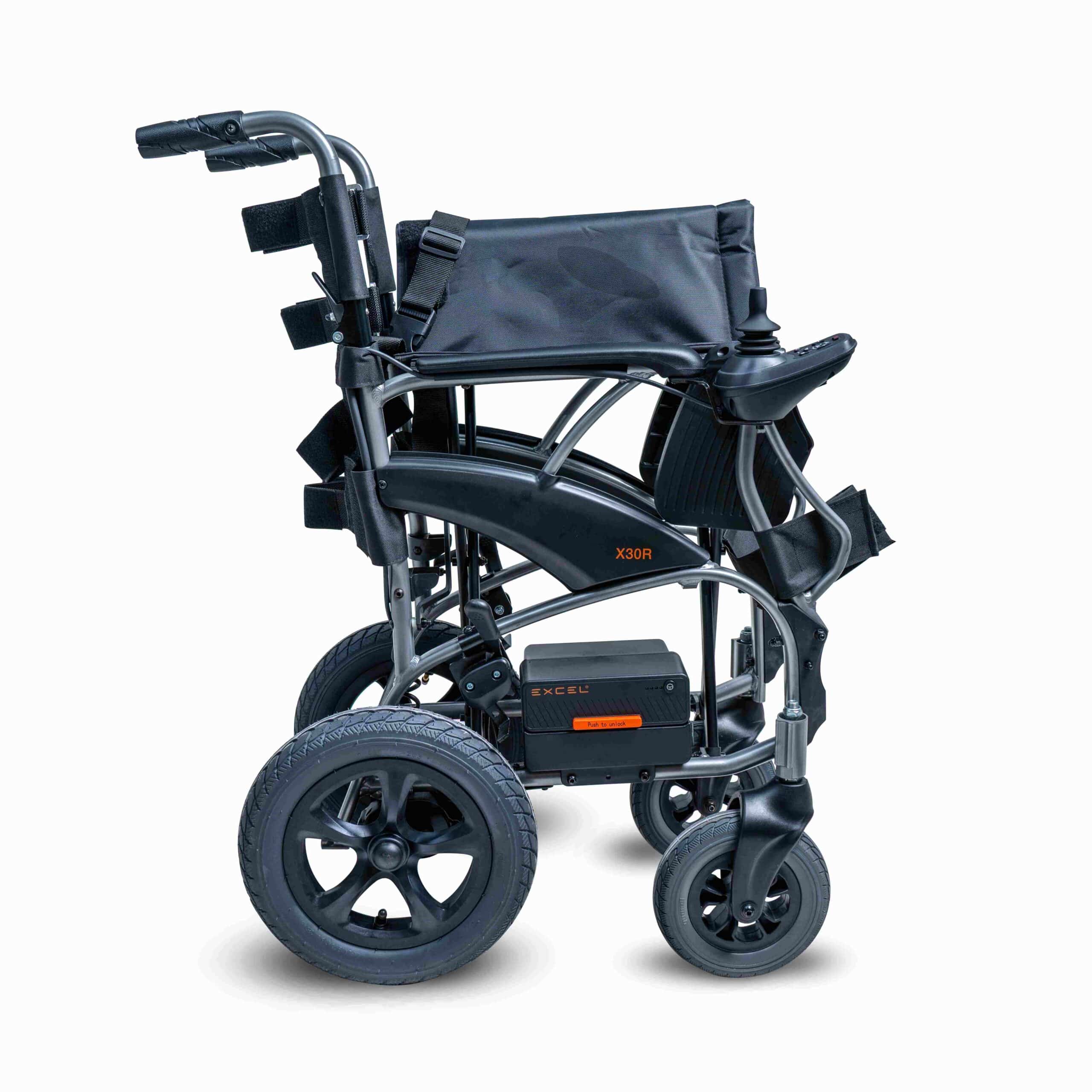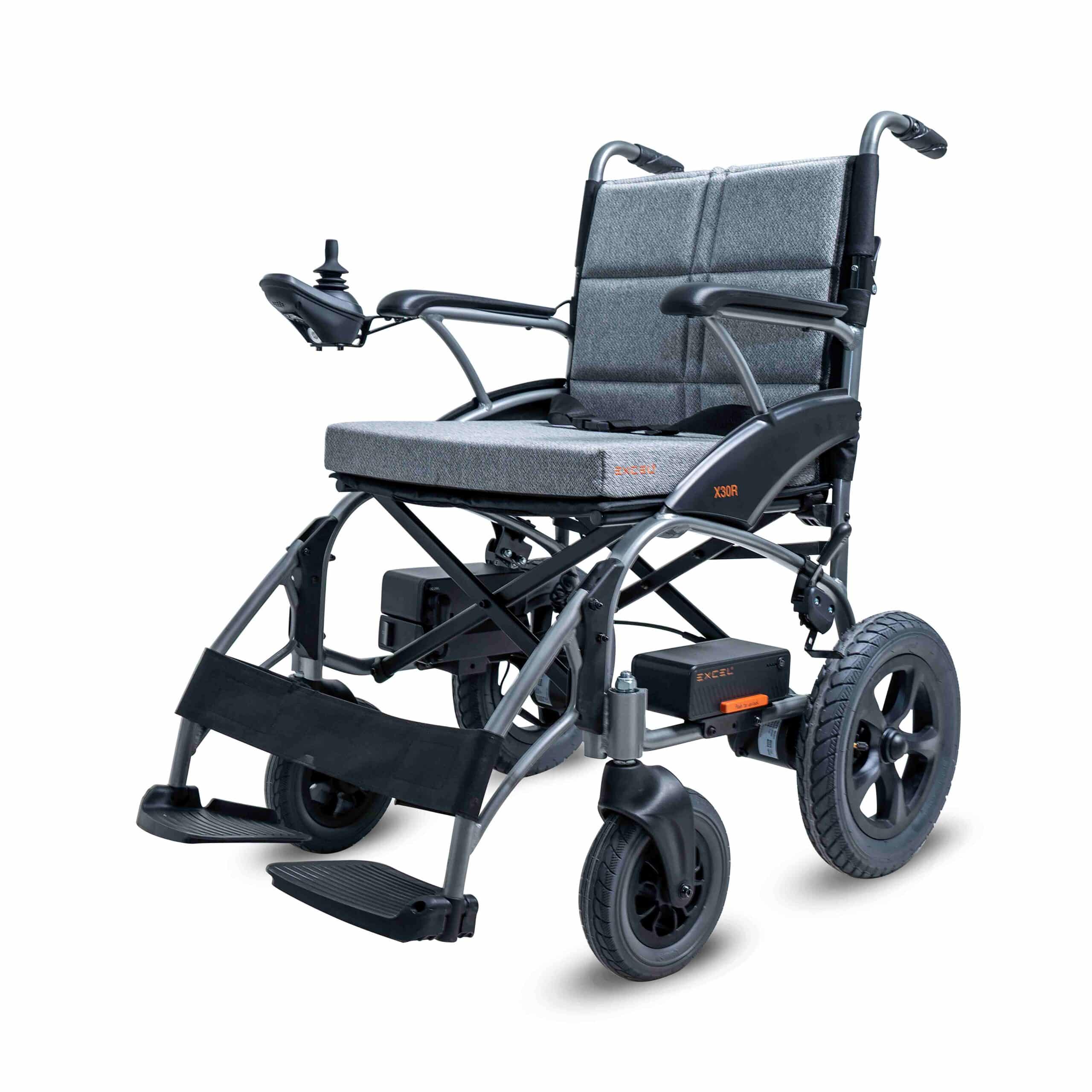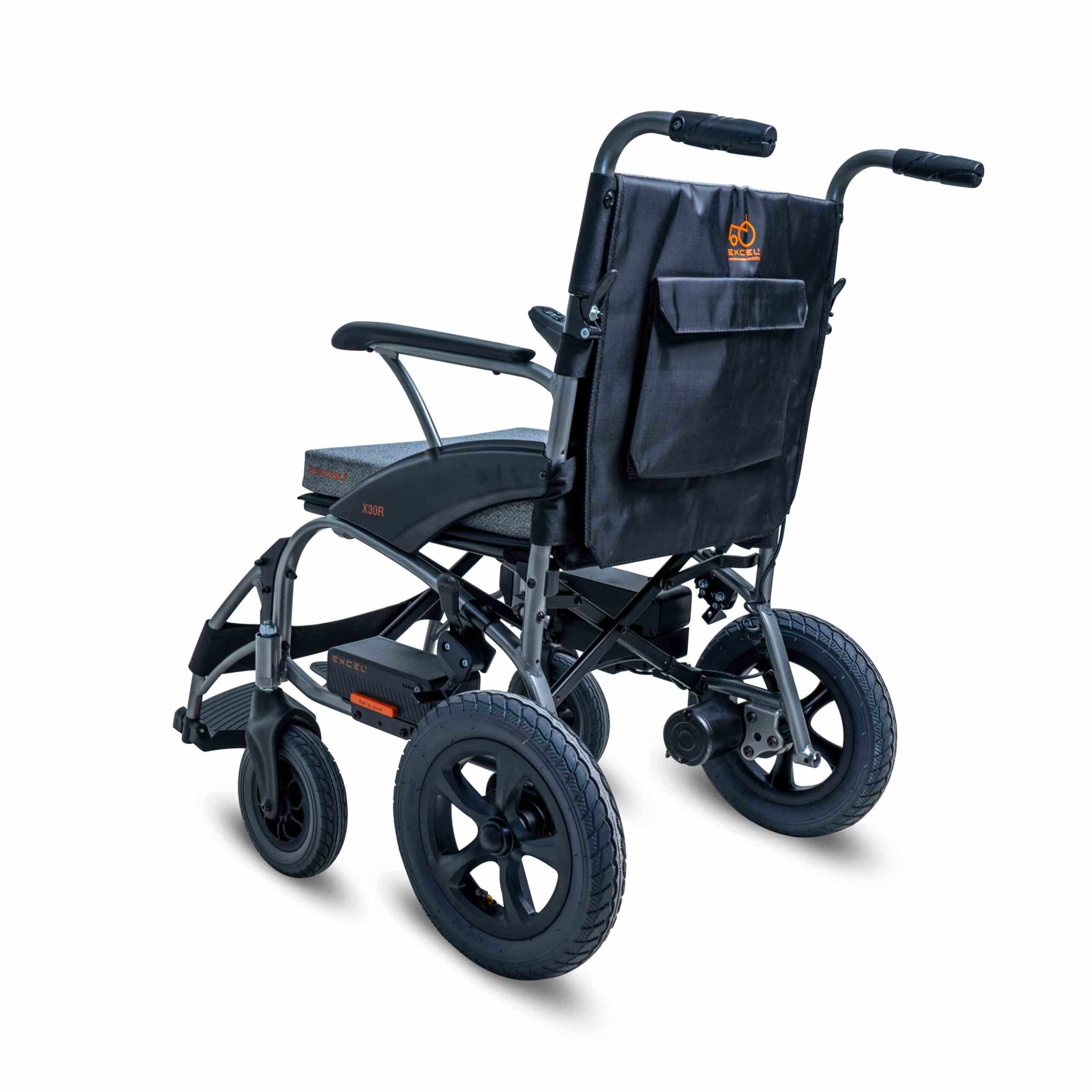 Excel X30R waży zaledwie 16,8 kg wraz z bateriami, co znacząco ułatwia jego przenoszenie. Aluminiowa rama gwarantuje wysoką wytrzymałość przy niskiej masie. Wózek można złożyć w kilka sekund bez użycia narzędzi. Po złożeniu zajmuje bardzo mało miejsca, co ułatwia transport i przechowywanie.