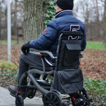 Kompaktowa szerokość 65 cm pozwala swobodnie przejeżdżać przez drzwi i korytarze. Pełne koła przednie 8” dobrze radzą sobie z progami i nierównościami. Tylne koła pneumatyczne 12” zapewniają stabilność i lepszą amortyzację. Dzięki temu wózek sprawdza się zarówno w mieszkaniu, jak i na chodnikach czy parkingach.