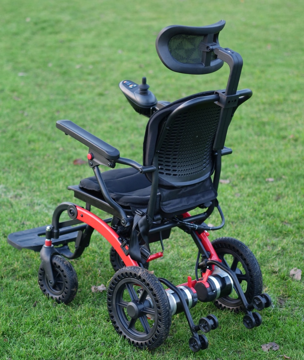 Dwa silniki 2×250 W współpracują z hamulcem elektromagnetycznym, który automatycznie zabezpiecza wózek po zatrzymaniu. Przednie amortyzatory poprawiają stabilność jazdy na nierównych chodnikach. Pełne koła 8″ z przodu oraz 12″ z tyłu są odporne na przebicia i nie wymagają pompowania. Odłączany akumulator 10 Ah można wygodnie ładować również poza wózkiem.
